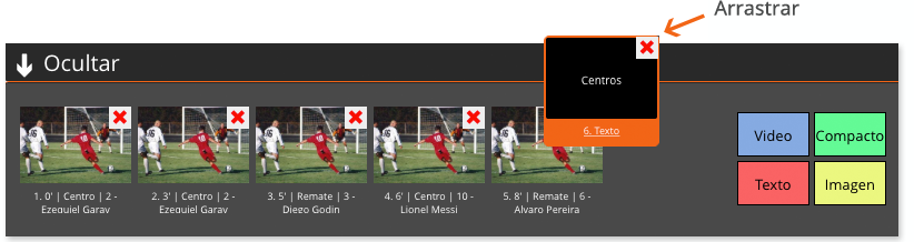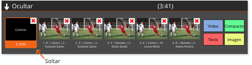 Usted tendrá total control sobre el orden de las diferentes secciones agregadas a la Playlist. Por ejemplo, para mover el texto «Centros» al inicio de la Playlist, haga clic en la miniatura en la sección de Armado de Playlist y arrástrela hacia la posición en la que quiera ubicar el texto.