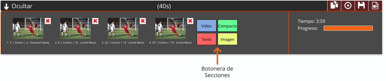 Además de eventos, usted puede agregar a la Playlist Imágenes, Texto, Video u otro Compacto ya generado. Estas opciones se encuentran en la Botonera de Secciones.