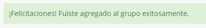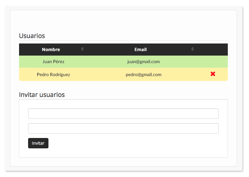 Luego encontrará un listado de los usuarios que pertenecen al grupo o que fueron invitados al mismo. Las filas señaladas en verde indican los usuarios actuales, y aquellas en amarillo los usuarios que fueron invitados pero aún no han  completado el proceso de crear su nuevo usuario.